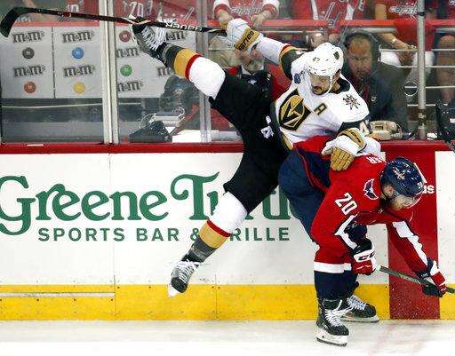 Washington Capitals forward Lars Eller (20), of Denmark, checks Vegas Golden Knights defenseman Luca Sbisa (47), of Italy, during the second period in Game 3 of the NHL hockey Stanley Cup Final, Saturday, June 2, 2018, in Washington. (AP Photo/Pablo Martinez Monsivais) The Associated Press