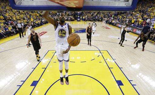 Golden State Warriors' Kevin Durant, center, dunks against the Cleveland Cavaliers during the second half of Game 1 of basketball's NBA Finals Thursday, May 31, 2018, in Oakland, Calif. (AP Photo/Marcio Jose Sanchez) The Associated Press