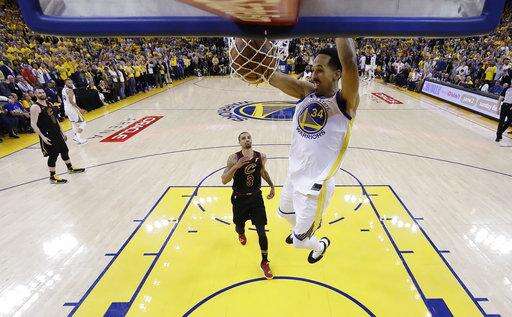 Golden State Warriors' Shaun Livingston (34) dunks past Cleveland Cavaliers' George Hill (3) during the second half of Game 1 of basketball's NBA Finals Thursday, May 31, 2018, in Oakland, Calif. (AP Photo/Marcio Jose Sanchez) The Associated Press