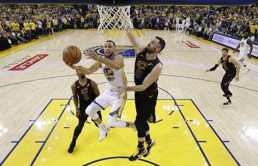 Golden State Warriors' Stephen Curry (30) drives to the basket as Cleveland Cavaliers' Kevin Love (0) defends during the second half of Game 1 of basketball's NBA Finals Thursday, May 31, 2018, in Oakland, Calif. (AP Photo/Marcio Jose Sanchez) The Associated Press