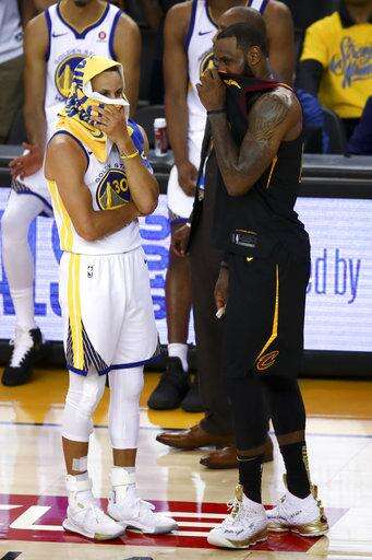 Golden State Warriors guard Stephen Curry, left, talks with Cleveland Cavaliers forward LeBron James during overtime of Game 1 of basketball's NBA Finals in Oakland, Calif., Thursday, May 31, 2018. The Warriors won 124-114. (AP Photo/Ben Margot) The Associated Press