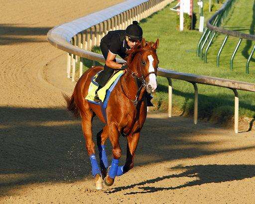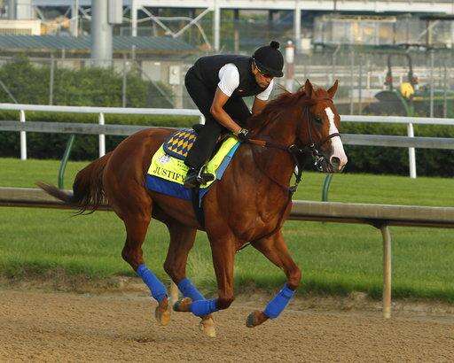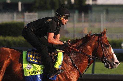 Kentucky Derby and Preakness winner Justify, ridden by exercise rider Humberto Gomez, works out at Churchill Downs, Thursday, May 24, 2018, in in Louisville, Ky./Courier Journal via AP) The Associated Press