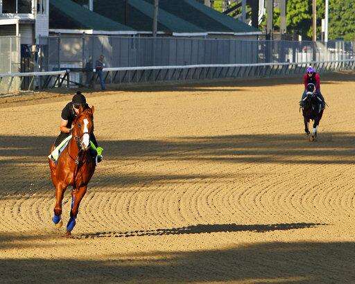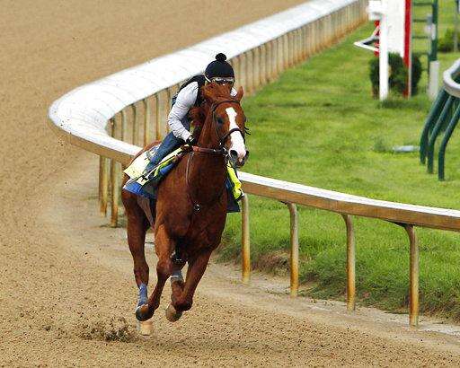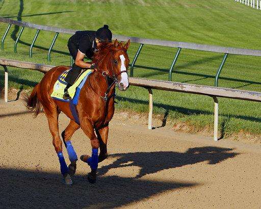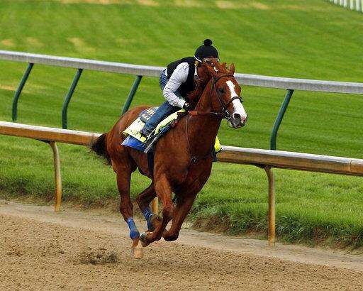 Justify, ridden by exercise rider Humberto Gomez, gallops at Churchill Downs in Louisville, Ky., Saturday, May 26, 2018 getting ready for The Belmont Stakes and a possible Triple Crown, in New York in June. (AP Photo/Garry Jones) The Associated Press