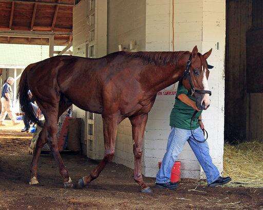 Justify cools down by walking the shed row of Barn 33 at Churchill Downs in Louisville, Ky., Saturday, May 26, 2018 following his morning gallop. Kentucky Derby and Preakness Stakes winner Justify is training for the 150th Belmont Stakes in New York and a possible Triple Crown title. (AP Photo/Garry Jones) The Associated Press