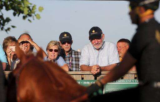 Railbirds watch Kentucky Derby and Preakness winner Justify, ridden by exercise rider Humberto Gomez, at Churchill Downs, Thursday, May 24, 2018, in in Louisville, Ky./Courier Journal via AP) The Associated Press