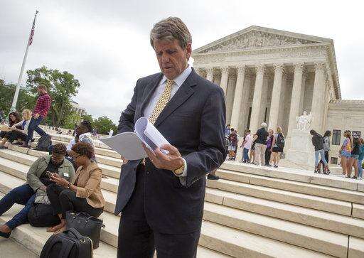 Michael Farris, CEO of the conservative Christian group Alliance Defending Freedom, looks at the decision in front of the Supreme Court, Monday, June 4, 2018 in Washington. The Supreme Court has ruled for a Colorado baker who wouldn't make a wedding cake for a same-sex couple in a limited decision that leaves for another day the larger issue of whether a business can invoke religious objections to refuse service to gay and lesbian people. (AP Photo/J. Scott Applewhite) The Associated Press