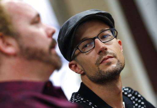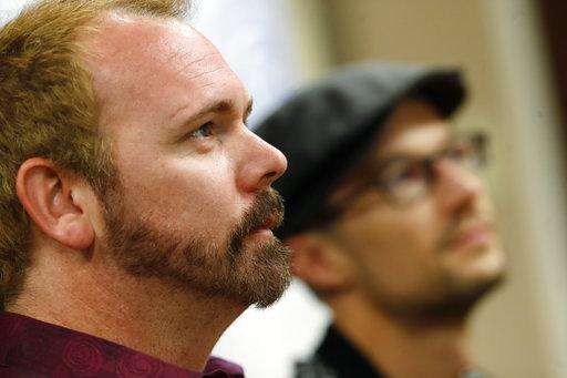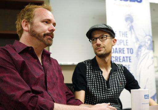 Charlie Craig, front, and David Mullins talk about a U.S. Supreme Court ruling that sets aside a Colorado court decision against a baker who would not make a wedding cake for the same-sex couple as they meet reporters Monday, June 4, 2018, in Denver. The Court has not decided on the larger issue in the case, however--whether a business can refuse to to serve gay and lesbian people. (AP Photo/David Zalubowski) The Associated Press