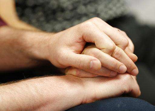 Charlie Craig and David Mullins hold hands as they talk about a U.S. Supreme Court ruling that sets aside a Colorado court decision against a baker who would not make a wedding cake for the same-sex couple as they meet reporters Monday, June 4, 2018, in Denver. The Court has not decided on the larger issue in the case, however--whether a business can refuse to to serve gay and lesbian people. (AP Photo/David Zalubowski) The Associated Press