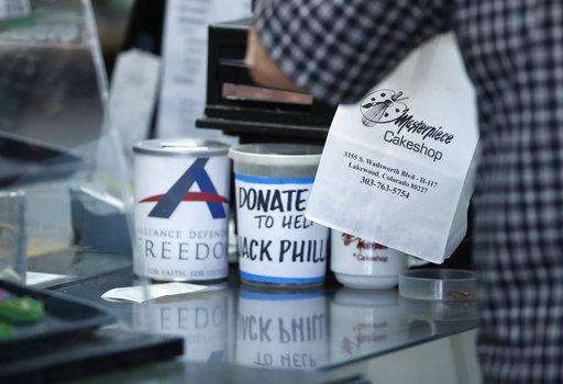 Donation tins sit next to the cash register as a customer picks up a bag of baked goods after paying baker Jack Phillips, owner of Masterpiece Cakeshop, Monday, June 4, 2018, in Lakewood, Colo., following the U.S. Supreme Court ruling that he could refuse to make a wedding cake for a same-sex couple because his religious beliefs did not violate Colorado's anti-discrimination law. (AP Photo/David Zalubowski) The Associated Press