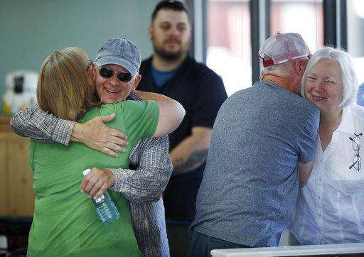 Supporters of baker Jack Phillips, owner of Masterpiece Cakeshop, hug inside Phillips' shop Monday, June 4, 2018, in Lakewood, Colo., after the U.S. Supreme Court ruled that he could refuse to make a wedding cake for a same-sex couple because his religious beliefs did not violate Colorado's anti-discrimination law. (AP Photo/David Zalubowski) The Associated Press