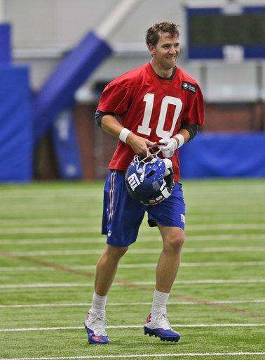 New York Giants quarterback Eli Manning smiles during practice at the NFL football team's training camp in East Rutherford, N.J., Monday, June 4, 2018. (AP Photo/Seth Wenig) The Associated Press