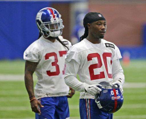 New York Giants' Janoris Jenkins, right, takes off his helmet during practice at the NFL football team's training camp in East Rutherford, N.J., Monday, June 4, 2018. (AP Photo/Seth Wenig) The Associated Press