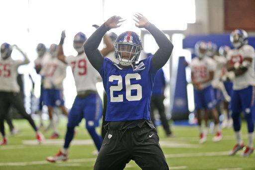 New York Giants' Saquon Barkley warms-up during practice at the NFL football team's training camp in East Rutherford, N.J., Monday, June 4, 2018. (AP Photo/Seth Wenig) The Associated Press