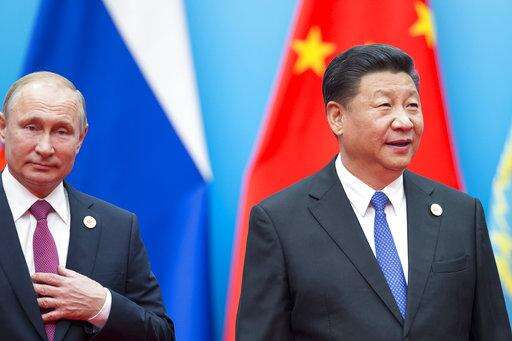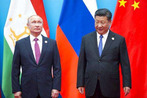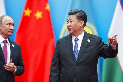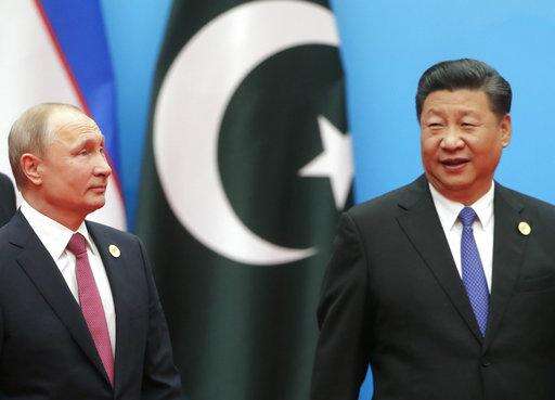 Chinese President Xi Jinping, right, and Russian President Vladimir Putin walk to attend talks at the Shanghai Cooperation Organization (SCO) Summit in Qingdao in eastern China's Shandong Province Sunday, June 10, 2018. (AP Photo/Alexander Zemlianichenko)