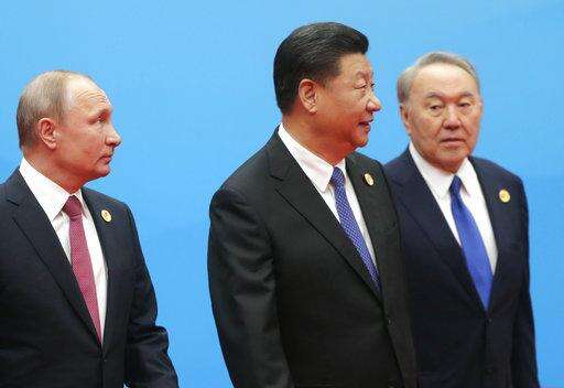 Chinese President Xi Jinping, center, and Russian President Vladimir Putin, center left, pose for a photo prior to a meeting of the Shanghai Cooperation Organization (SCO) Summit along with other heads of states participating in Qingdao in eastern China's Shandong Province, Sunday, June 10, 2018. China will seek to further promote its economic links with Central Asia during this weekend's summit of the China and Russia-dominated SCO. (AP Photo/Alexander Zemlianichenko)