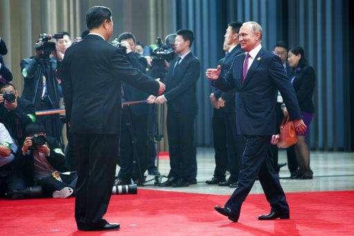 Chinese President Xi Jinping, right, welcomes Russian President Vladimir Putin for talks at the Shanghai Cooperation Organization (SCO) Summit in Qingdao in eastern China's Shandong Province Sunday, June 10, 2018. (AP Photo/Alexander Zemlianichenko)