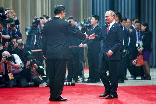 Chinese President Xi Jinping, left, shakes hands with Russian President Vladimir Putin during an arriving ceremony at the Shanghai Cooperation Organization (SCO) Summit in Qingdao in eastern China's Shandong Province Sunday, June 10, 2018. (AP Photo/Alexander Zemlianichenko) The Associated Press