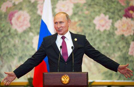 Russian President Vladimir Putin gestures while speaking during his news conference after the Shanghai Cooperation Organization (SCO) Summit in Qingdao in eastern China's Shandong Province, Sunday, June 10, 2018. Putin says counter-terrorism efforts are a priority for a regional grouping led by Moscow and Beijing. Putin said a new agreement approved by the SCO spells out plans for joint-anti-terror efforts for the next three years. The SCO includes China, Russia, four ex-Soviet Central Asian nations, India and Pakistan. (AP Photo/Alexander Zemlianichenko)