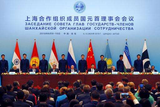 From left: Indian Prime Minister Narendra Modi, Kyrgyz President Sooronbay Jeenbekov, Tajikistan President Imomali Rakhmon, Russian President Vladimir Putin, Chinese President Xi Jinping, Kazakh President Nursultan Nazarbayev, Uzbekistan's President Shavkat Mirziyoyev and Pakistani President Mamnoon Hussain pose for a photo prior to their talks at the Shanghai Cooperation Organization (SCO) Summit in Qingdao in eastern China's Shandong Province Sunday, June 10, 2018. (AP Photo/Alexander Zemlianichenko)
