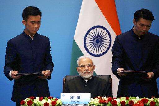 Leaders of member states of the Shanghai Cooperation Organization (SOC) from left Indian Prime Minister Narendra Modi, Tajikistan President Imomali Rakhmon, Russian President Vladimir Putin, Chinese President Xi Jinping, Kazakh President Nursultan Nazarbayev, Uzbekistan's President Shavkat Mirziyoyev and President of Pakistan Mamnoon Hussain sign an agreements for the SOC summit in Qingdao in eastern China's Shandong Province, Sunday, June 10, 2018. Xi extolled free trade and criticized "selfish, short-sighted" policies during the closely orchestrated gathering, standing in stark contrast with the G-7 summit that ended in disarray over trade tensions. (AP Photo/Dake Kang)