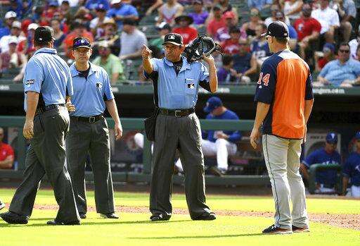 ARLINGTON, Texas (AP) - Houston manager A.J. Hinch thought it was clear that Texas closer Keone Kela balked with the go-ahead run at third base in the ninth inning.