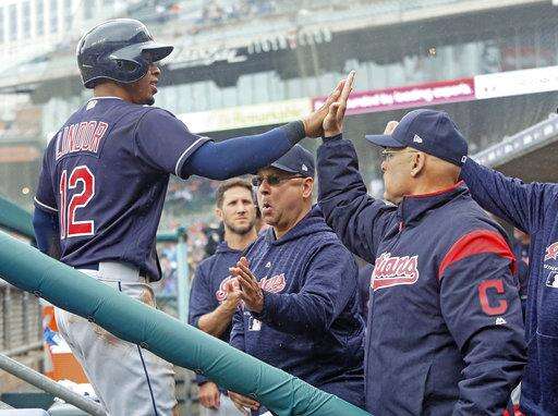 Cleveland Indians' Francisco Lindor, left, is congratulated by manager Terry Francona, after scoring against the Detroit Tigers on a hit by Yonder Alonso during the second inning of a baseball game Sunday, June 10, 2018, in Detroit. (AP Photo/Duane Burleson) The Associated Press