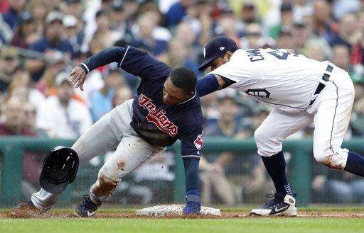 Detroit Tigers third baseman Jeimer Candelario, right, tags out Cleveland Indians' Greg Allen, left, sliding past third base while trying to advance from second base during the fifth inning of a baseball game Sunday, June 10, 2018, in Detroit. (AP Photo/Duane Burleson) The Associated Press