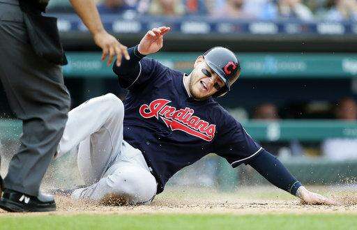 Cleveland Indians' Roberto Perez scores from first base on a double Erik Gonzalez during the sixth inning of a baseball game against the Detroit Tigers Sunday, June 10, 2018, in Detroit. The Indians defeated the Tigers 9-2. (AP Photo/Duane Burleson) The Associated Press