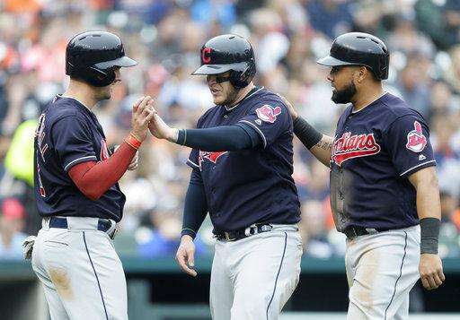 Cleveland Indians' Lonnie Chisenhall, left, celebrates with Roberto Perez, center, and Melky Cabrera, right, after they scored against the Detroit Tigers on a double by Erik Gonzalez during the sixth inning of a baseball game Sunday, June 10, 2018, in Detroit. (AP Photo/Duane Burleson) The Associated Press