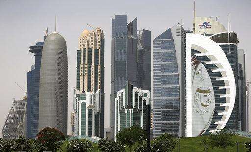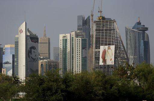 In this May 5, 2018 photo, the images of the Emir of Qatar, Sheikh Tamim bin Hamad Al Thani hang on the towers in Doha, Qatar. A year into a blockade by four Arab states against Qatar, the small country has weathered the storm by drawing from its substantial financial coffers, using its strategic location in the Persian Gulf as the world’s largest producer of liquefied natural gas to continue shipments to major world powers, and forging tight alliances with countries like Turkey and Iran. (AP Photo/Kamran Jebreili) The Associated Press