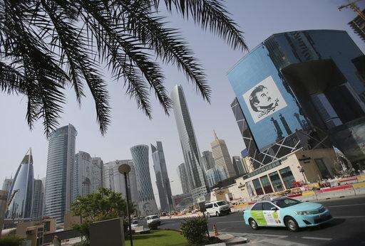 In this May 5, 2018 photo, a taxi passes by a building with the image of the Emir of Qatar, Sheikh Tamim bin Hamad Al Thani, in Doha, Qatar. A year into a blockade by four Arab states against Qatar, the small country has weathered the storm by drawing from its substantial financial coffers, using its strategic location in the Persian Gulf as the world’s largest producer of liquefied natural gas to continue shipments to major world powers, and forging tight alliances with countries like Turkey and Iran. (AP Photo/Kamran Jebreili) The Associated Press