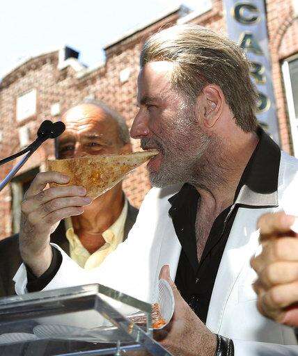 This image released by Starpix shows actor John Travolta, star of the upcoming film "Gotti," eating a slice of pizza from Lenny's Pizzeria in the Brooklyn borough of New York on Tuesday, June 12, 2018. The pizzeria was highlighted in the 1977 blockbuster "Saturday Night Fever" when Travoltaâs Tony Manero character ordered two slices and ate them one on top of the other as he walked down the street. The restaurant has become a popular tourist spot with people still ordering the double-decker slices. (Patrick Lewis/Starpix via AP)