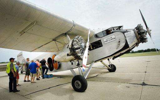 In this Thursday, June 14, 2018 photo, passengers line up for a flight on the Liberty Museum Ford Tri-Motor aircraft Central Illinois Regional Airport in Bloomington, Ill. The flights are sponsored by the Experimental Aircraft Association and several local Twin Cities business. The flights are available to the public and scheduled to be flown through Sunday. The plane first flew in 1928. (David Proeber /The Pantagraph via AP) The Associated Press