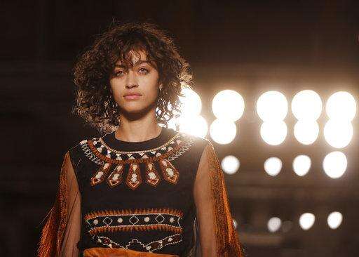 The cruise collection featured ethnic casual looks in khaki, burned orange and olive green with Native American geometrical detailing and hippie fringe. The luxury Coachella looks included cargo pants and studded jackets to embroidered chiffon dresses.