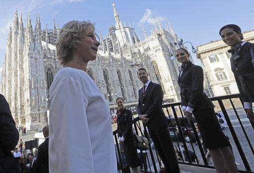 Sharply dressed Alitalia flight attendants decked out in new uniforms designed by Ferretti greeted the fashion crowd climbing a grand outdoor staircase near Milan's Duomo cathedral to see the designer's latest cruise looks.