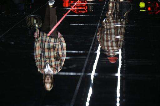 The collection also had flashes of color in PVC trench coats, shorts with longer under-layers and pouches that strap on the waist or hang around the neck. Sandals and thick-soled shoes were worn with slouchy camel-colored socks.