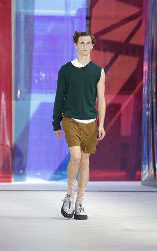 Mesh suit jackets gave an edge to polo shirts and straight trousers with sporty striped detailing down the sides. Leather anoraks were perforated, worn over the double-F-logo knitwear. Suit jackets were paired with short-shorts styled from the trousers. But there were also knee-length skorts - a mix of shorts with a skirt - for anyone looking for a kilt alternative, worn with a paper-thin transparent shirt with diagonal stripes.