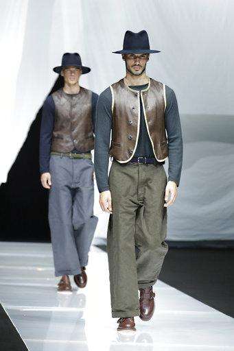 Many of the looks were finished with a gaucho-style hat that matched the ruggedness of a pair of jacketless looks with weathered leather vests over black T-shirts. Denim was light blue and soft in pleated trousers with matching cropped jackets or collarless shirts.
