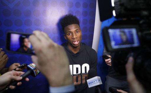 FILE - In this May 17, 2018, file photo, Hamidou Diallo, from Kentucky, speaks with the media at the NBA draft basketball combine, in Chicago. Most of the furniture was taken out of several rooms on the 15th and 16th floor of the hotel in downtown Chicago. There's a couple tables, a few chairs, and when the doors open to those suites draft hopefuls can make or break their futures in 20 minutes. This is where the interviews happen for the draft, where teams meet players and ask them about everything from their family histories to their thoughts on highway safety before investing millions of dollars. (AP Photo/Charles Rex Arbogast, FIle) The Associated Press