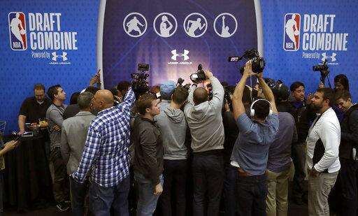 FILE - In this May 18, 2018, file photo, reporters and photographers surround Trae Young, from Oklahoma, during the interview segment of the NBA draft basketball combine, in Chicago. Most of the furniture was taken out of several rooms on the 15th and 16th floor of the hotel in downtown Chicago. There's a couple tables, a few chairs, and when the doors open to those suites draft hopefuls can make or break their futures in 20 minutes. This is where the interviews happen for the draft, where teams meet players and ask them about everything from their family histories to their thoughts on highway safety before investing millions of dollars. (AP Photo/Charles Rex Arbogast, File) The Associated Press