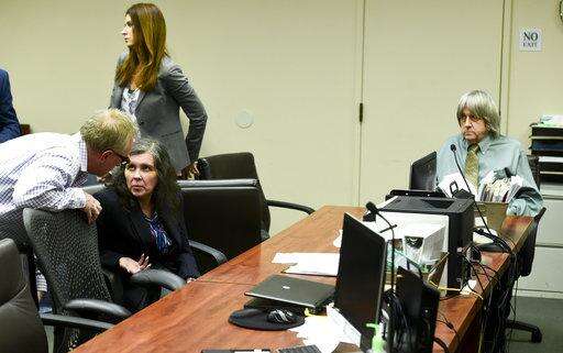 The couple was arrested in January after their 17-year-old daughter, who spent two years planning an escape, climbed out a window and left the home in Perris, then called 911. By the time police arrived at the house 70 miles (113 kilometers) southeast of Los Angeles, two girls, 11 and 14, had been hastily released from their chains, but a 22-year-old son remained shackled.