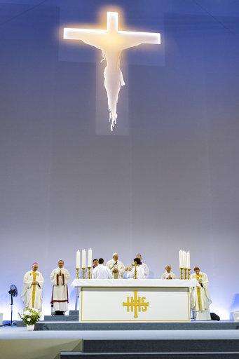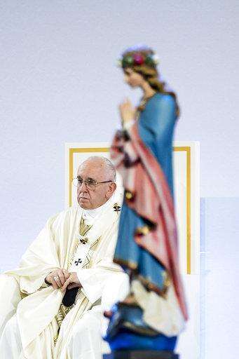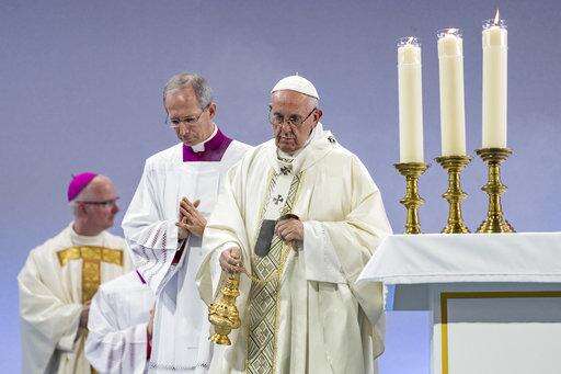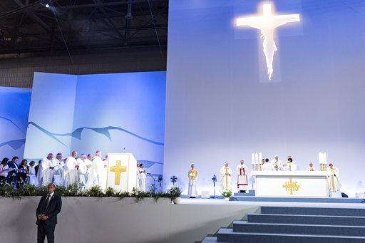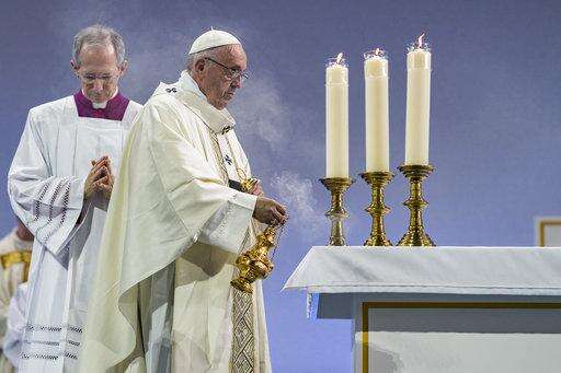 Pope Francis celebrates the Holy Mass, at the Palexpo hall, in Geneva, Switzerland, Thursday, June 21, 2018. Pope Francis visit the World Council of Churches on occasion of its 70th anniversary. (Jean-Christophe Bott/Keystone via AP) The Associated Press