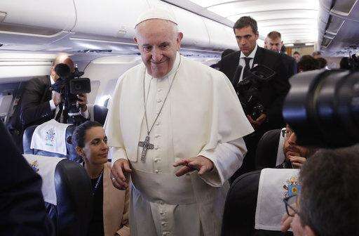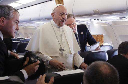 Pope Francis meets the press aboard the plane to Geneva, Switzerland, Thursday, June 21, 2018. The one-day visit is part of celebrations marking the 70th anniversary of the World Council of Churches. (AP Photo/Alessandra Tarantino) The Associated Press
