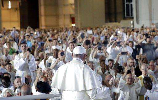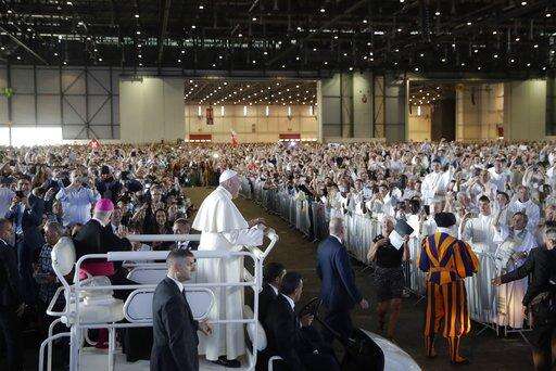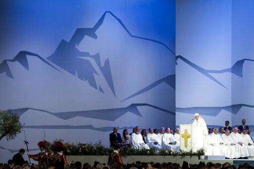 Pope Francis celebrates the Holy Mass at Palexpo hall in Geneva, Switzerland, Thursday, June 21, 2018. Pope Francis visits the World Council of Churches as centrepiece of the ecumenical commemoration of the WCC's 70th anniversary. (Martial Trezzini/pool photo via AP) The Associated Press
