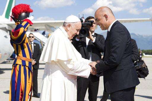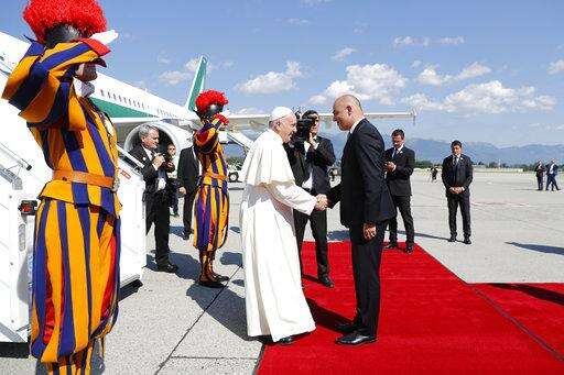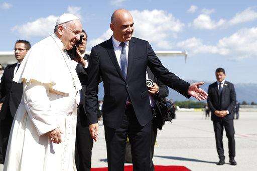 Pope Francis is welcomed by Swiss president Alain Berset, after his arrival in Geneva, Switzerland, Thursday, June 21, 2018. Pope Francis Francis arrived for a one-day visit to promote his view that Christians, whatever their theological differences, can join forces to work for peace and justice in the world. (Peter Klaunzer/Keystone via AP) The Associated Press