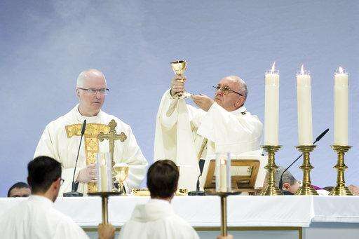 Pope Francis, right, celebrates the Holy Mass at Palexpo hall in Geneva, Switzerland, Thursday, June 21, 2018. Pope Francis visits the World Council of Churches as centrepiece of the ecumenical commemoration of the WCC's 70th anniversary. (Martial Trezzini/pool photo via AP) The Associated Press