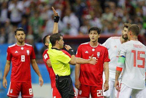 Referee Andres Cunha from Uruguay blows his whistle and indicates that VAR had shown that Iran's Morteza Pouraliganji had handled the ball into the net, and no goal was givenduring the group B match between Iran and Spain at the 2018 soccer World Cup in the Kazan Arena in Kazan, Russia, Wednesday, June 20, 2018. (AP Photo/Sergei Grits) The Associated Press