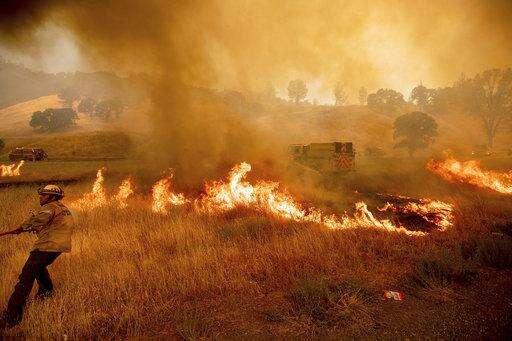The fast-moving blaze that broke out Saturday in western Yolo County charred at least 34 square miles (88 square kilometers) of dry brush and threatened more than two dozen structures in ranchland northwest of Sacramento. No injuries were reported and the exact number of people evacuated was unclear.