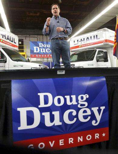 FILE - In this June 20, 2018 file photo, Arizona Gov. Doug Ducey, R, speaks at a campaign rally in Tempe, Ariz. The outrage sparked by the sights, sounds and stories of children separated from parents at the U.S.-Mexico border underscores the outsized role immigration will play in the midterms of this border state. Both Democrats and Republicans think the issue can propel them to victory in Arizona, a state with a large percentage of residents born abroad. (AP Photo/Matt York, File) The Associated Press
