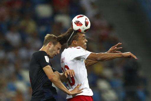 Denmark's Yussuf Yurary Poulsen, right, goes for a header with Croatia's Ivan Strinic during the round of 16 match between Croatia and Denmark at the 2018 soccer World Cup in the Nizhny Novgorod Stadium, in Nizhny Novgorod , Russia, Sunday, July 1, 2018. (AP Photo/Darko Bandic)